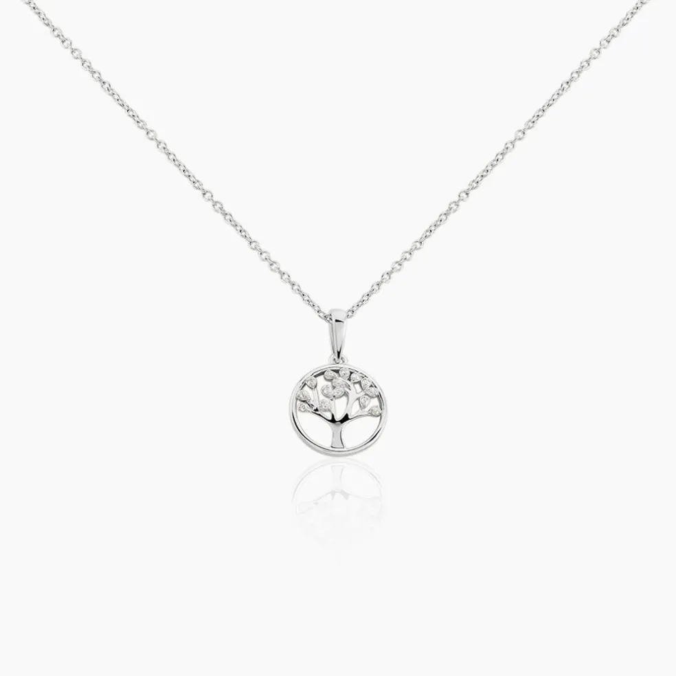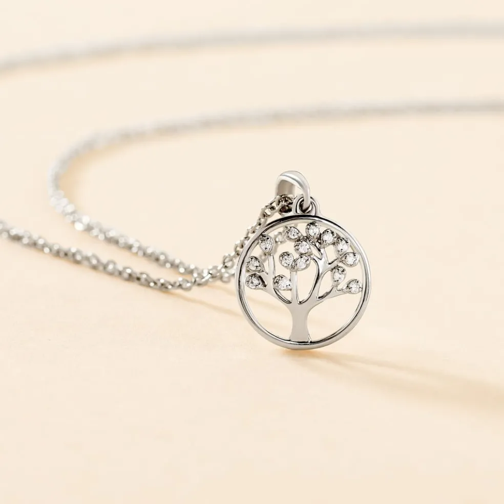 Collier Argent Blanc 925/1000 Arbre De Vie Oxyde De Zirconium Serti Griffes Maille Forcat 42+3cm