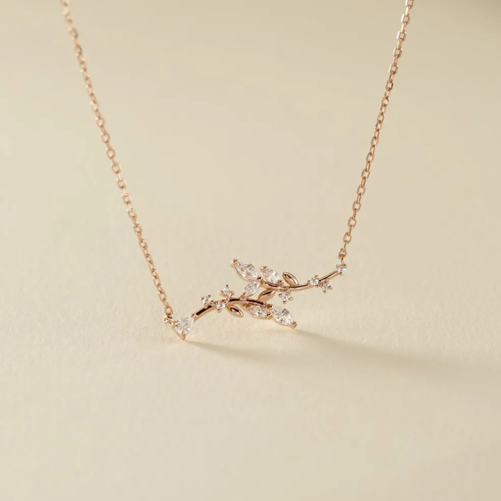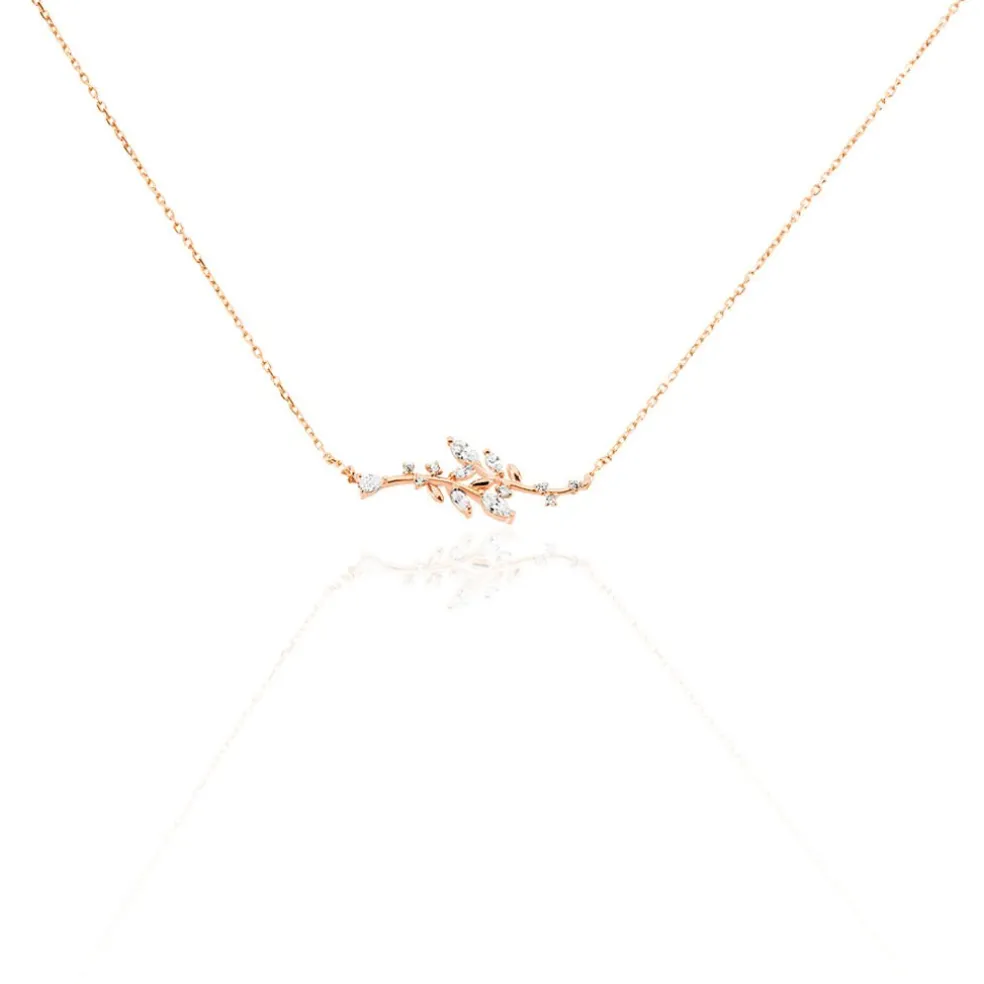 Collier Argent Rose 925/1000 Motif Feuilles Oxydes De Zirconium 45cm