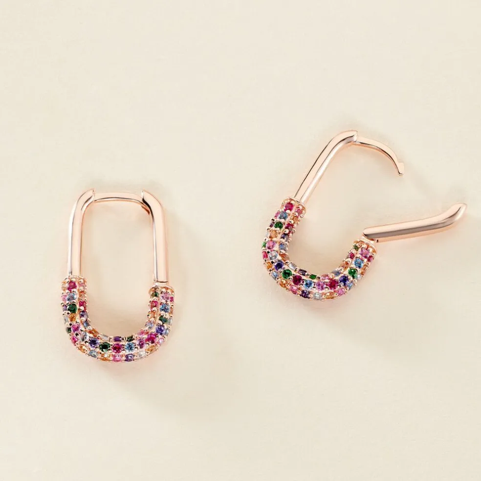 Créoles Rectangulaires Argent Rose 925/1000 Pavage Pierres Multicolores 22.9*7.66mm