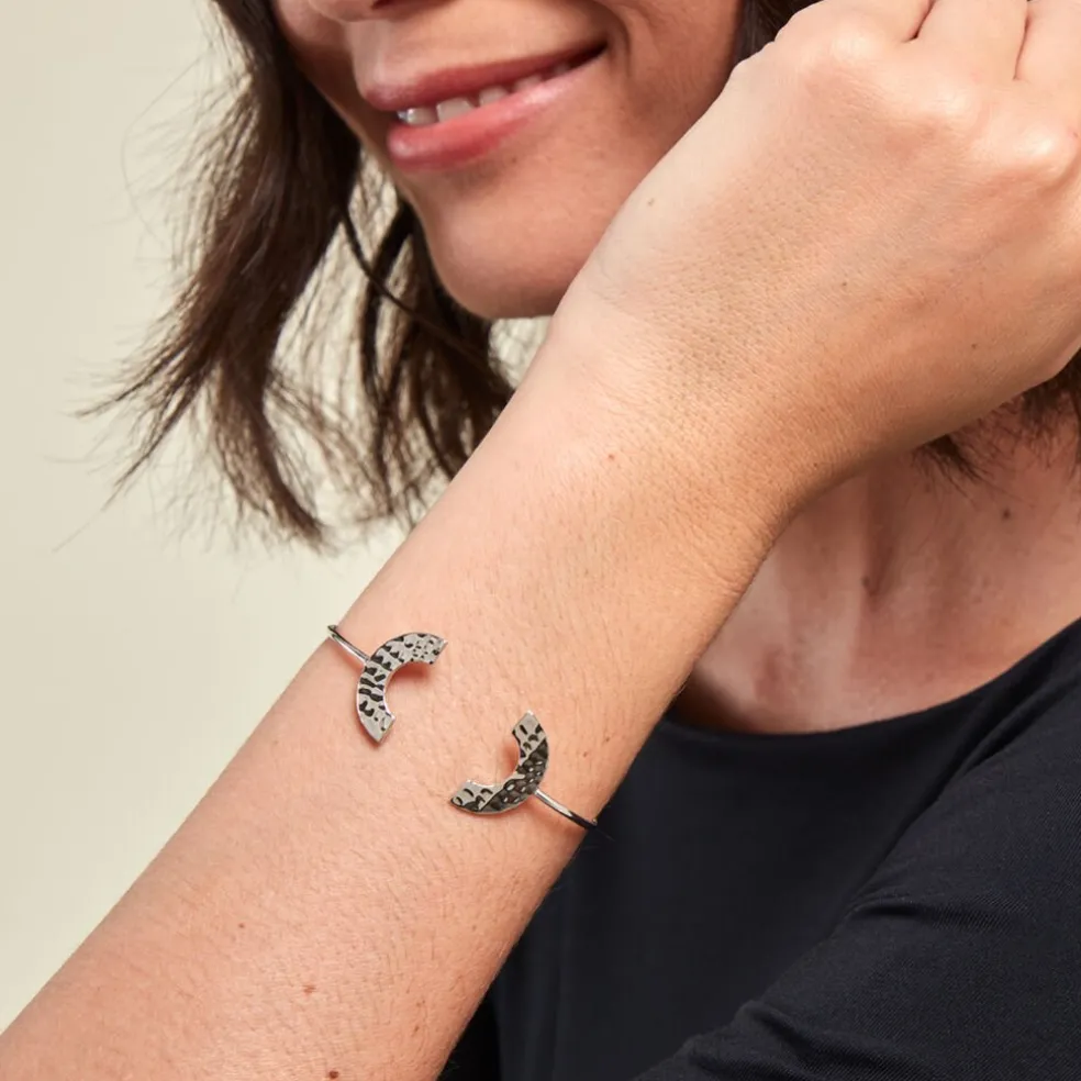 Bracelet Jonc Argent Blanc 925/1000 Double Demi Cercle Effet Martelé Diamètre 55mm