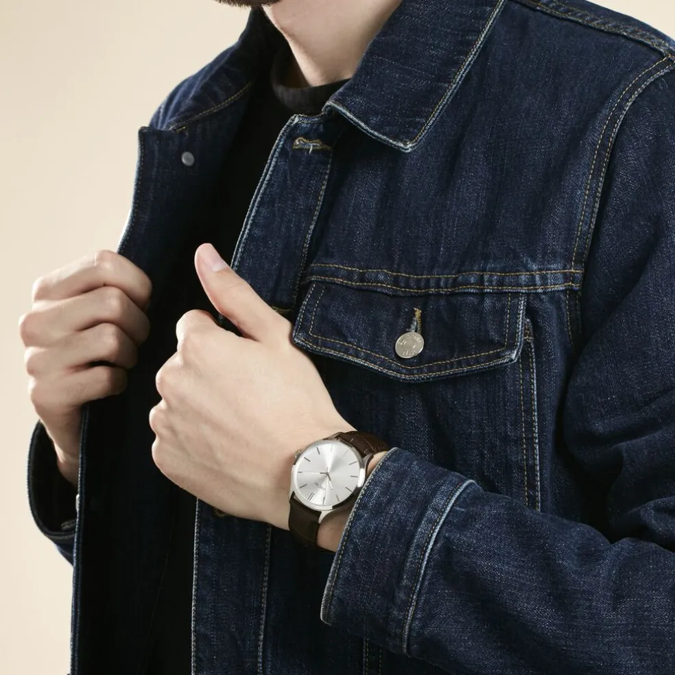 Montre Arctik Micro Alliage Argenté Ronde Quartz 40mm Fond Argenté Bracelet Cuir Vache Effet Alligator Marron P100988-c