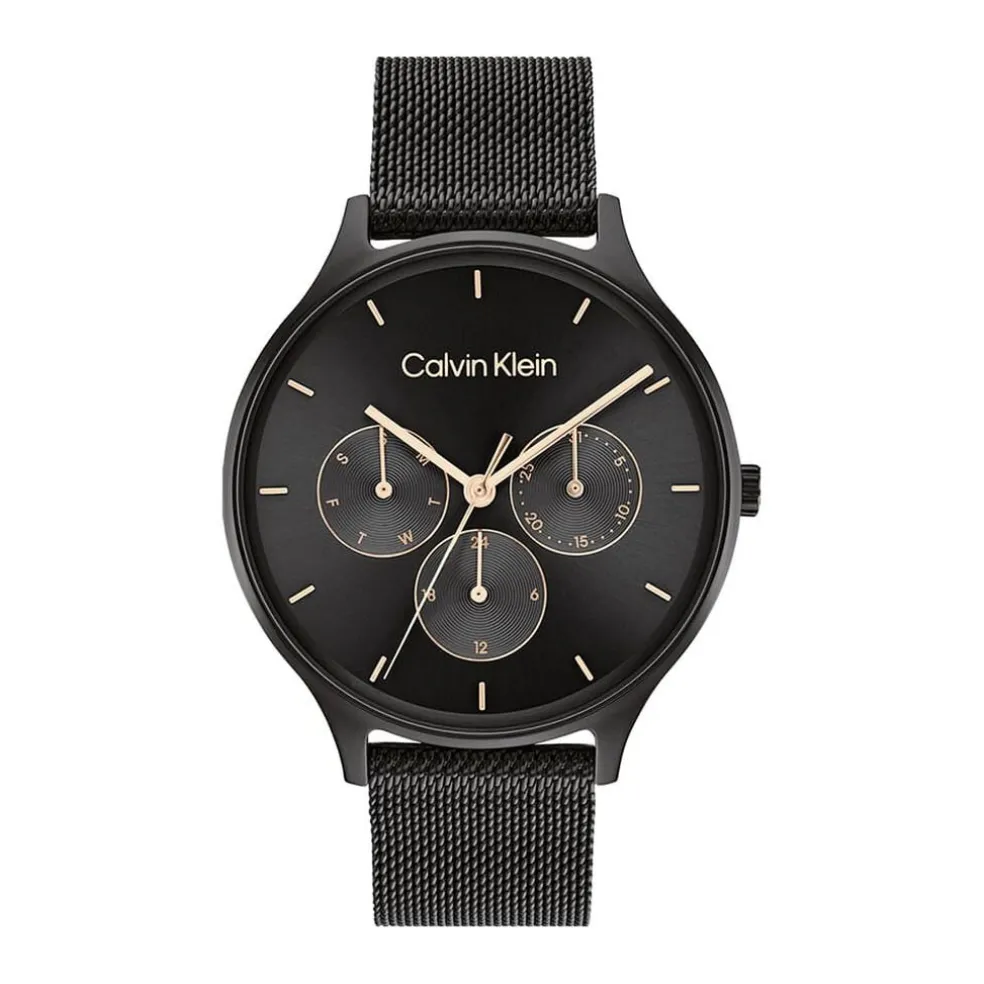 Montre Calvin Klein Timeless Multi Acier Noir Ronde Quartz 38mm Fond Noir Bracelet Maille Milanaise Acier Noir 25200105