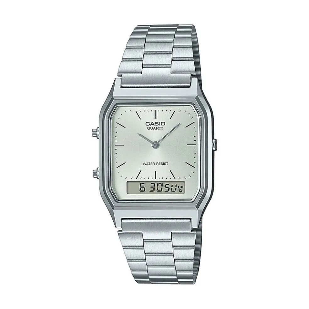 Montre Casio Collection Vintage Resine Argente Carre Quartz 29.8mm Lunette Plastique Fond Gris Bracelet Acier Argente Biseaute Aq-230a-7amqyes