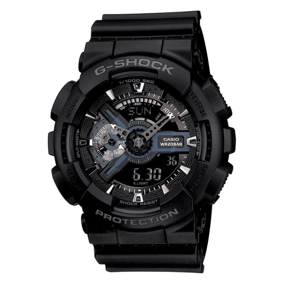 Montre Casio G-shock Black & White Resine Noire Ronde Quartz Chronographe 51mm Fond Noir Et Index Argenté Bracelet Resine Noire Ga-110-1ber