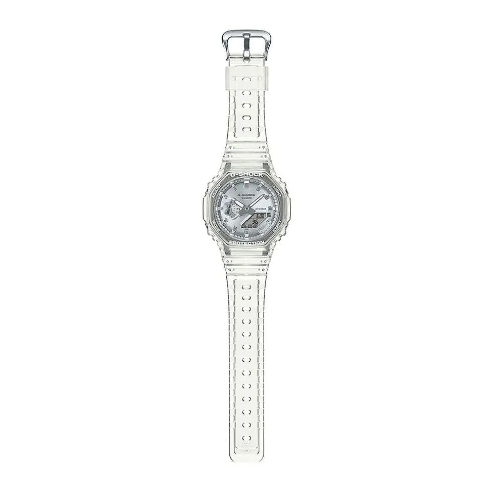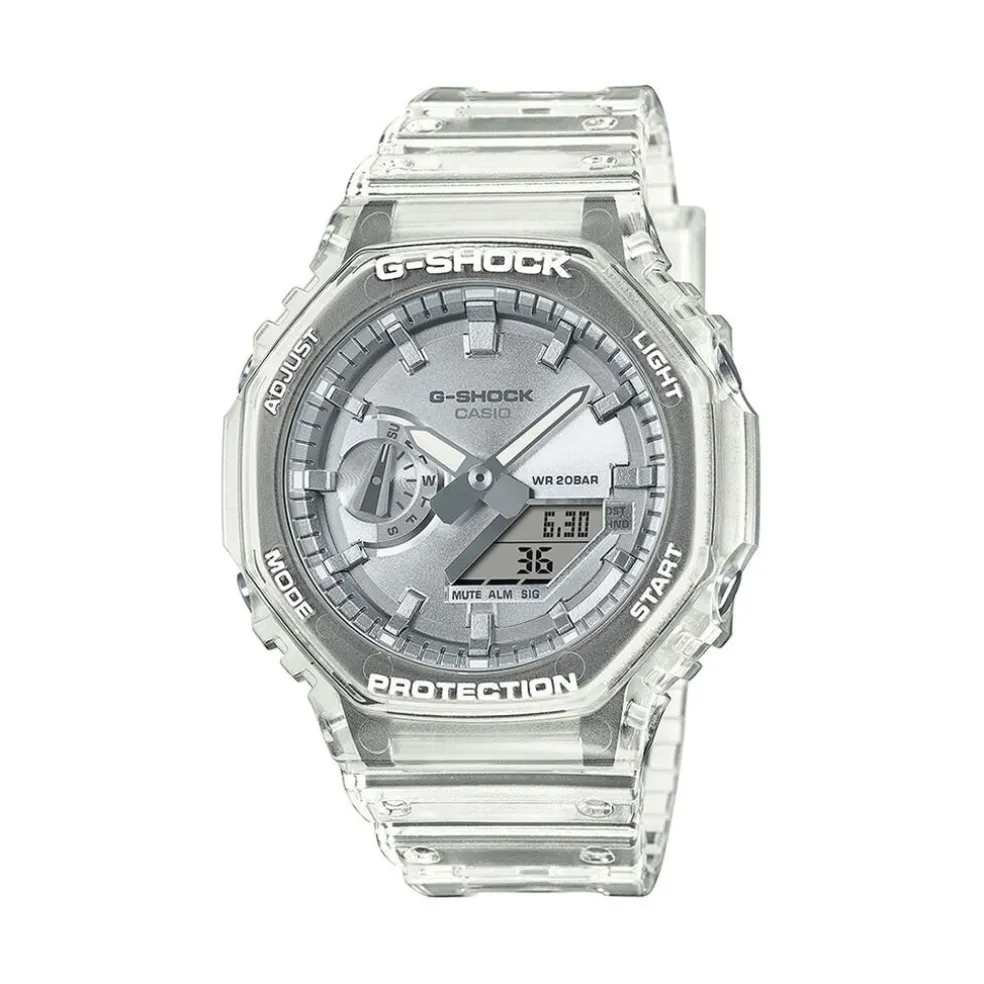 Montre Casio G-shock Acier Argente Quartz Anadigitale Ronde 45.4mm Fond Argenté Bracelet Résine Blanc Transparent Ga-2100bm-7a8er