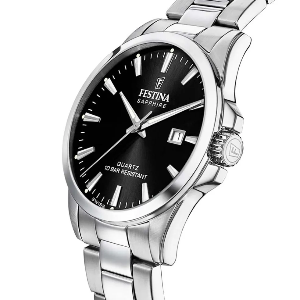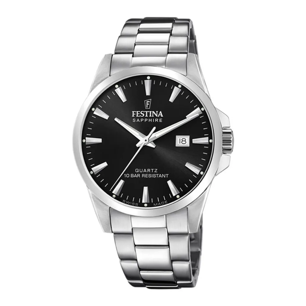 Montre Festina Swiss Made Acier Argente Ronde Quartz 41mm Fond Noir Bracelet Acier Argente F20024/4