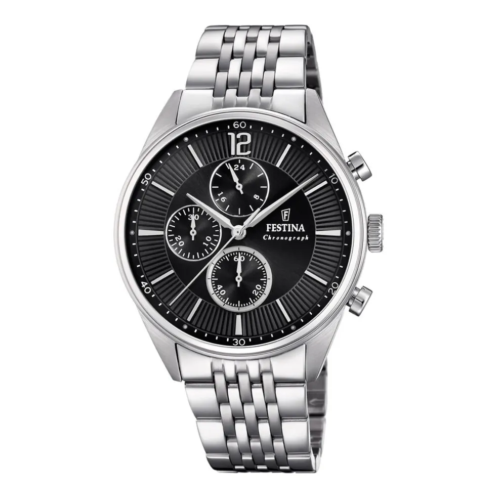 Montre Festina Timeless Chronograph Acier Blanc Ronde Quartz Chronographe 42mm Fond Noir Bracelet Acier Blanc F202854
