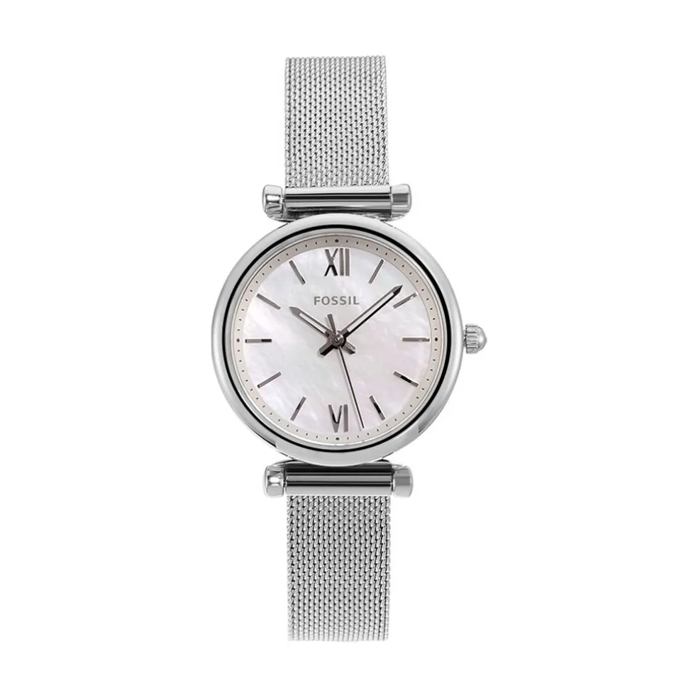 Montre Fossil Carlie Mini Acier Blanc Ronde Quartz 28mm Fond Nacre Blanc Bracelet Acier Blanc Es4432