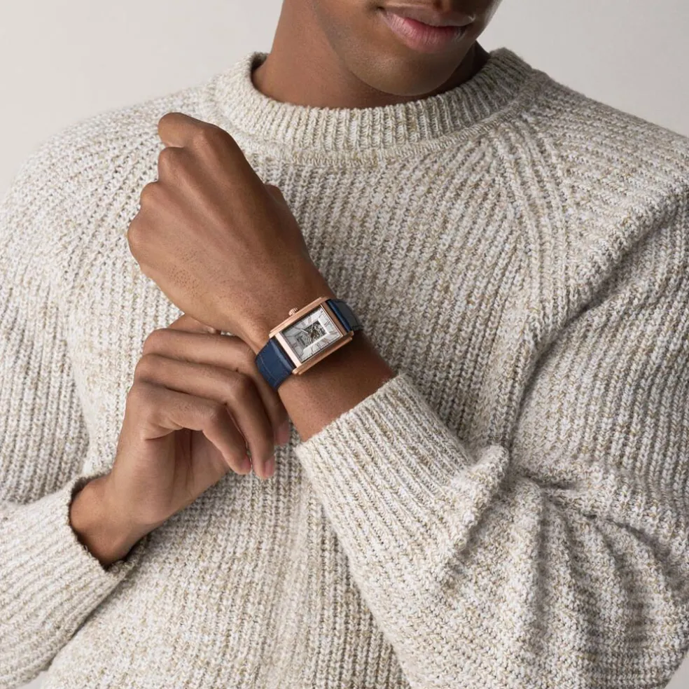 Montre Fossil Carraway Automatic Acier Inoxydable Dore Rose Automatique Rectangulaire 30Mm Fond Argenté C艙ur Ouvert Bracelet Cuir De Vache Bleu Me3274
