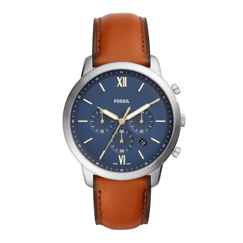 Montre Fossil Neutra Chrono Acier Blanc Ronde Quartz 44mm Fond Bleu Bracelet Cuir Marron Fs5453