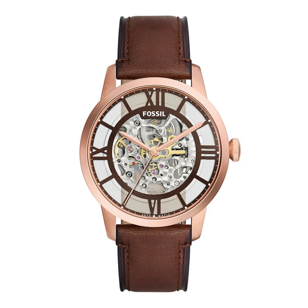 Montre Fossil Townsman Acier Rosé Ronde Automatique 44mm Fond Marron Bracelet Cuir De Vache Marron Me3259