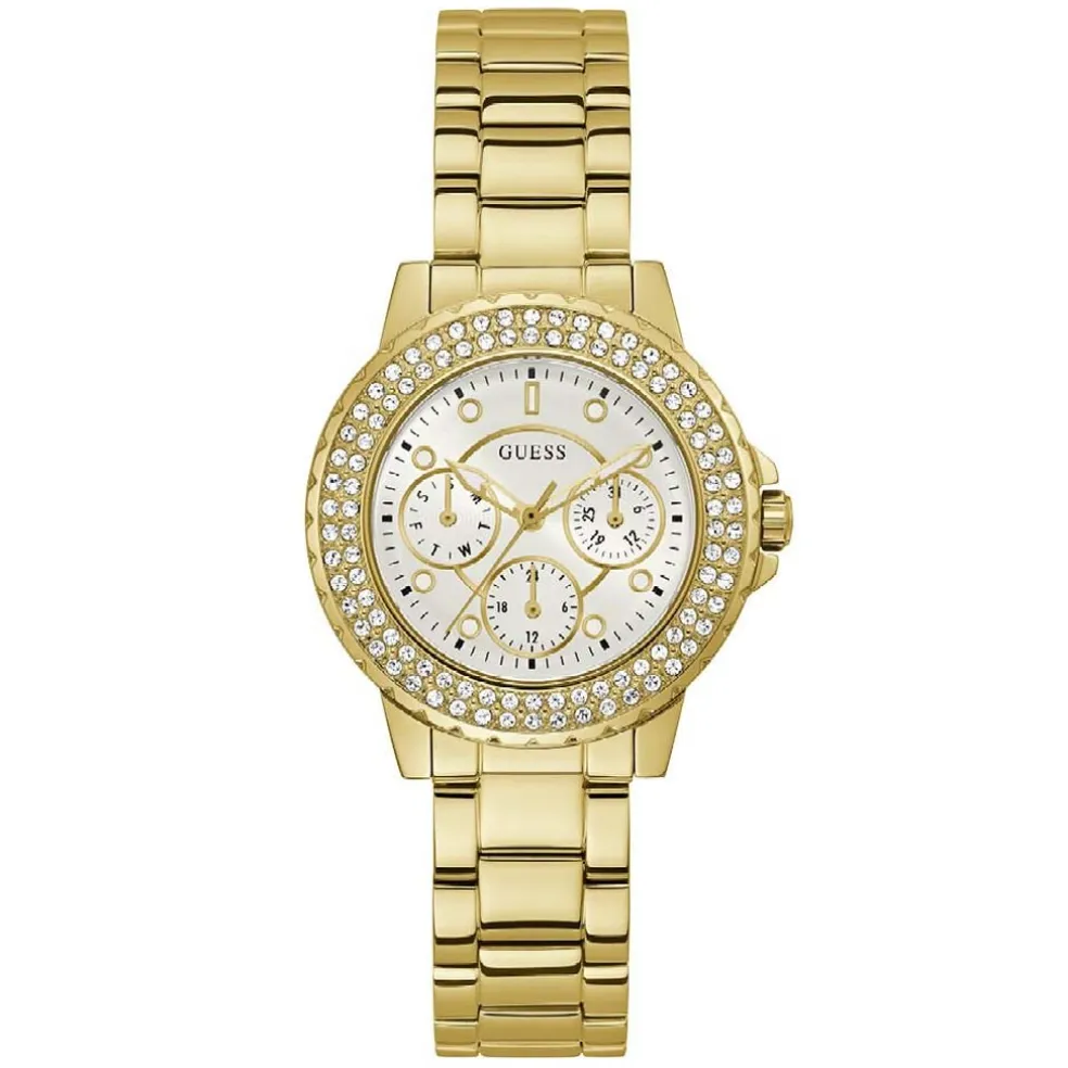 Montre Guess Crown Jewel Acier Doré Ronde Quartz Multifonctions 36mm Fond Blanc Lunette Strass Bracelet Acier Doré Gw0410l2