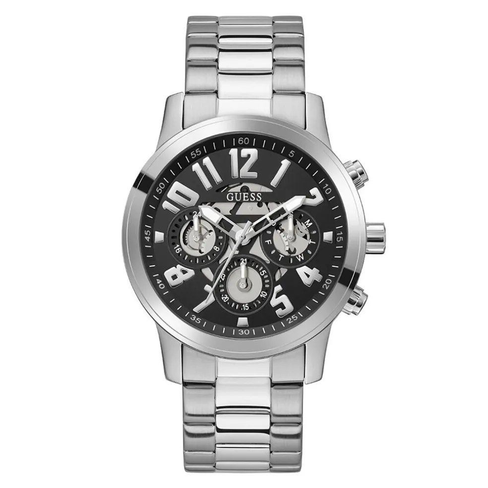 Montre Guess Parker Acier Argenté Rond Quartz Multifonction 44mm Fond Noir Bracelet Acier Argenté Gw0627g1