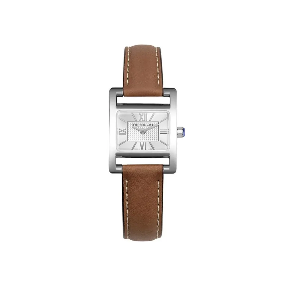 Montre Herbelin 5Eme Avenue Acier Inoxydable Argenté Quartz Rectangulaire 23,4X19Mm Fond Argenté Bracelet Cuir De Veau Marron 17537Ap08Gd