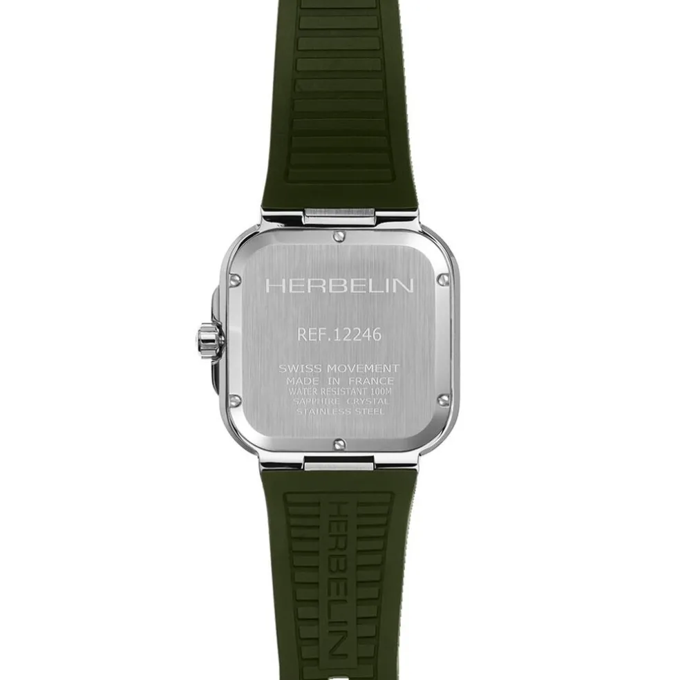 Montre Herbelin Cap Camarat Acier Inoxydable Argenté Quartz Carre 39Mm Fond Kaki Bracelet Silicone Kaki 12246A116Ck