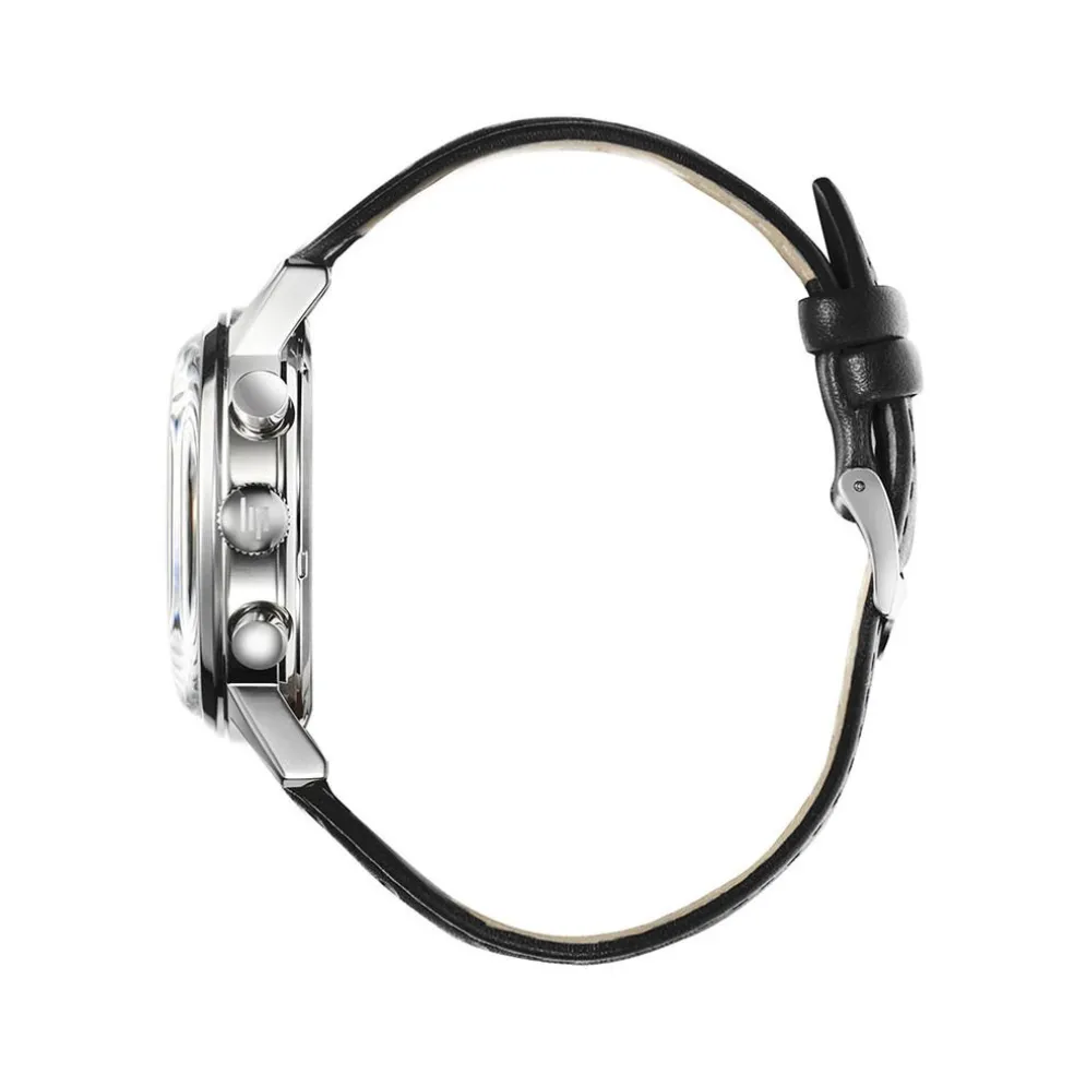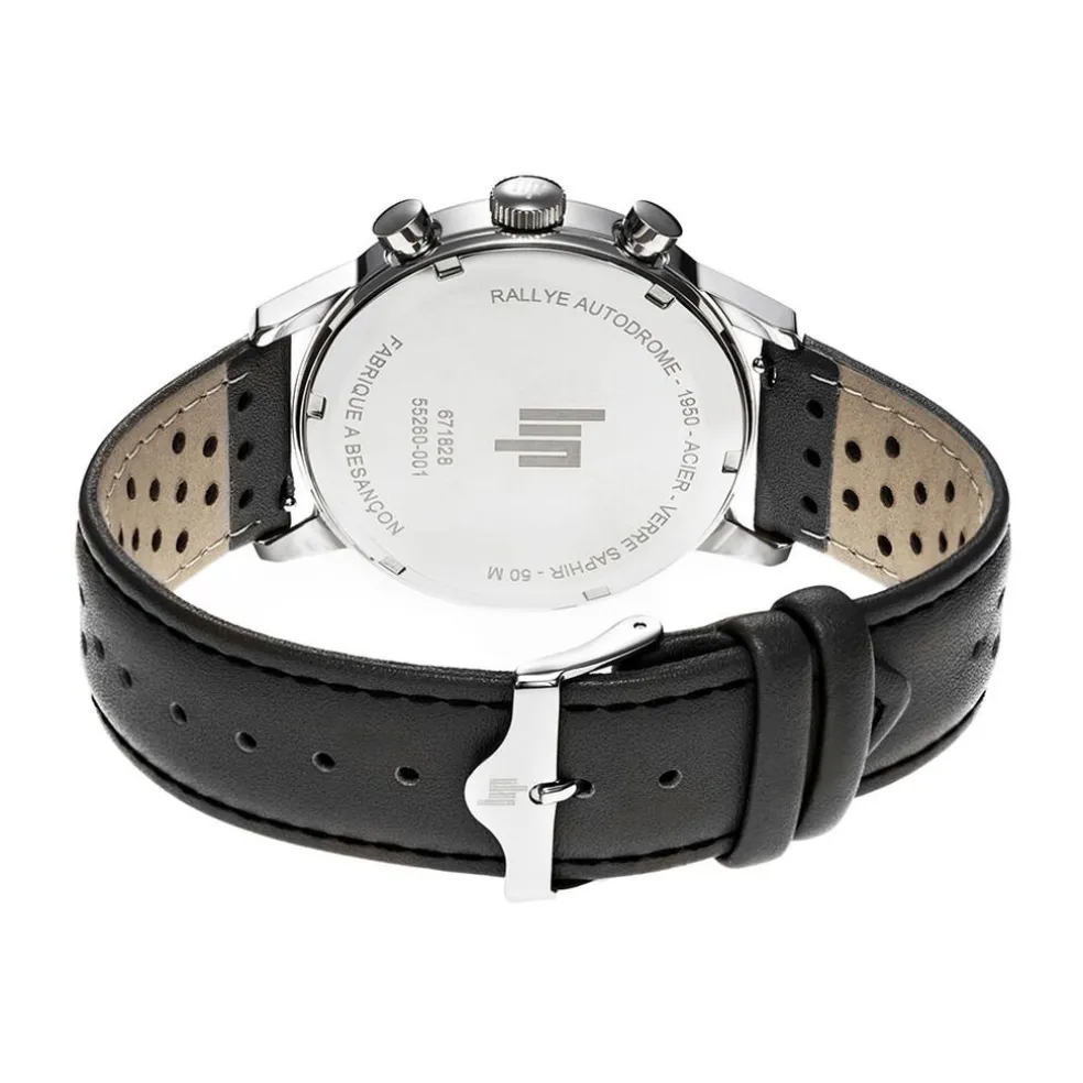 Montre Lip Rallye Autodrome Acier Inoxydable Argenté Meca Quartz Chronographe Ronde 40Mm Fond Argenté Bracelet Cuir De Veau Ajoure Noir 671828