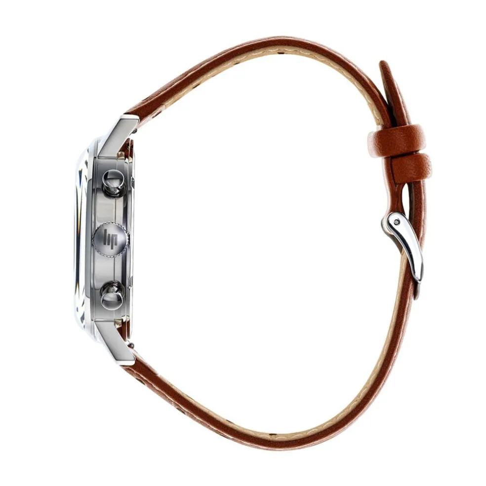 Montre Lip Rallye Meca Quartz Acier Inoxydable Argenté Quartz Chronographe Ronde 39Mm Fond Bleu Bracelet Cuir De Veau Ajoure Marron Clair 671807