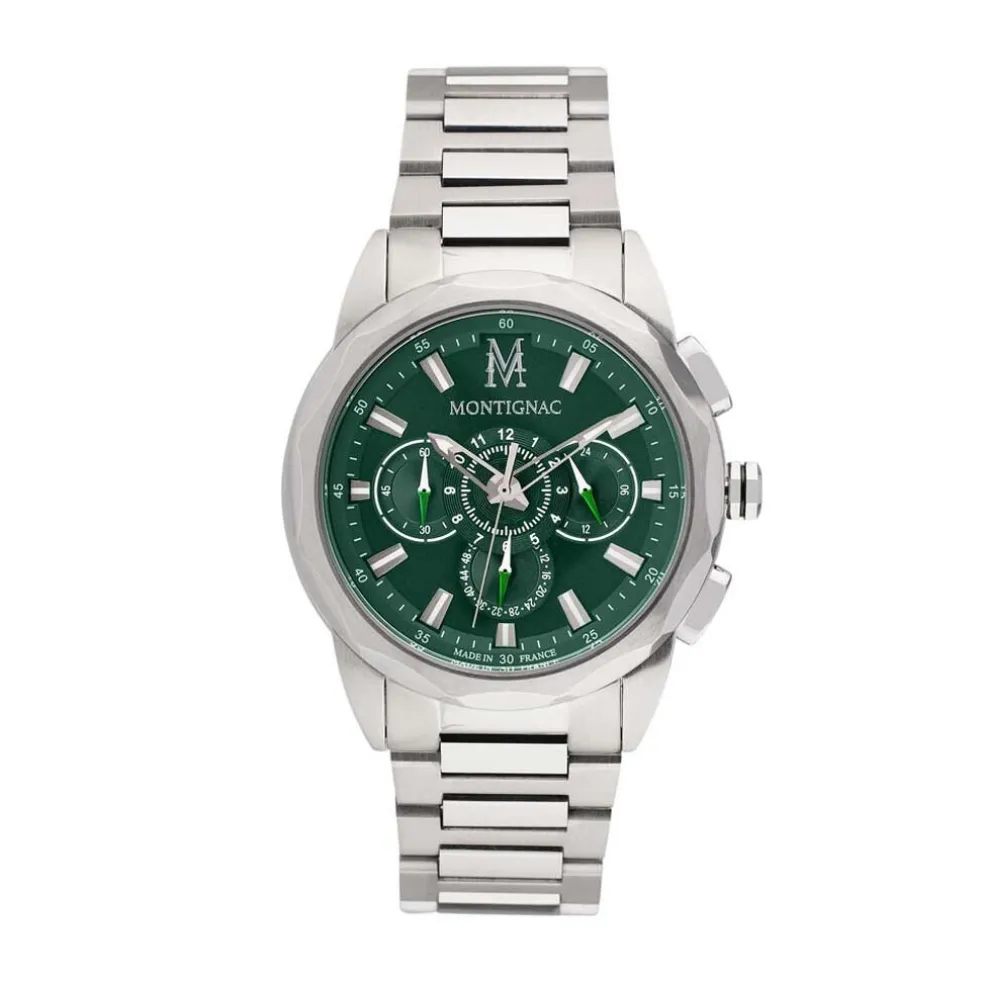 Montre Montignac Round Multifonction Acier Argente Ronde Quartz 42mm Fond Vert Lunette Argentee Bracelet Acier Argente Mow906