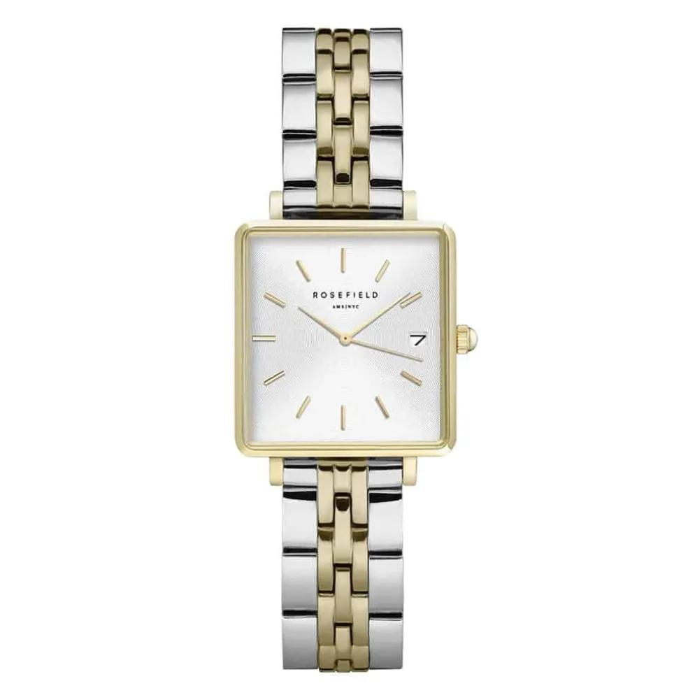 Montre Rosefield Boxy Xs Acier Doré Carré Quartz 22x24mm Fond Blanc Bracelet Acier Bicolore Qmwssg-q023