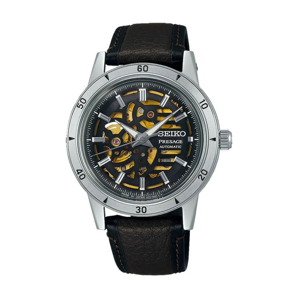 Montre Seiko Presage Acier Argenté Ronde Automatique Squelette 39.5mm Fond Marron Bracelet Cuir De Veau Marron Ssa461j1