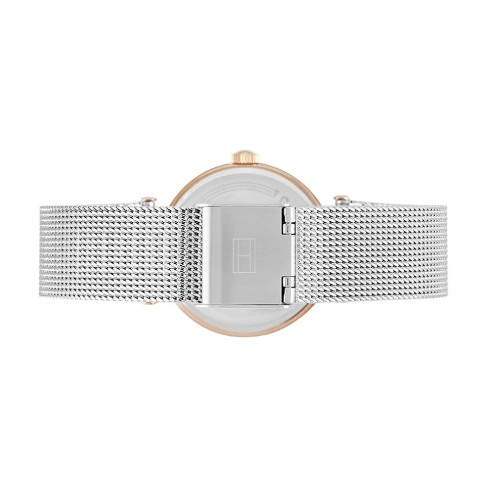 Montre Tommy Hilfiger Lynn Acier Doré Rose Ronde Quartz 32mm Fond Argenté Bracelet Acier Blanc Maille Milanaise 1781863